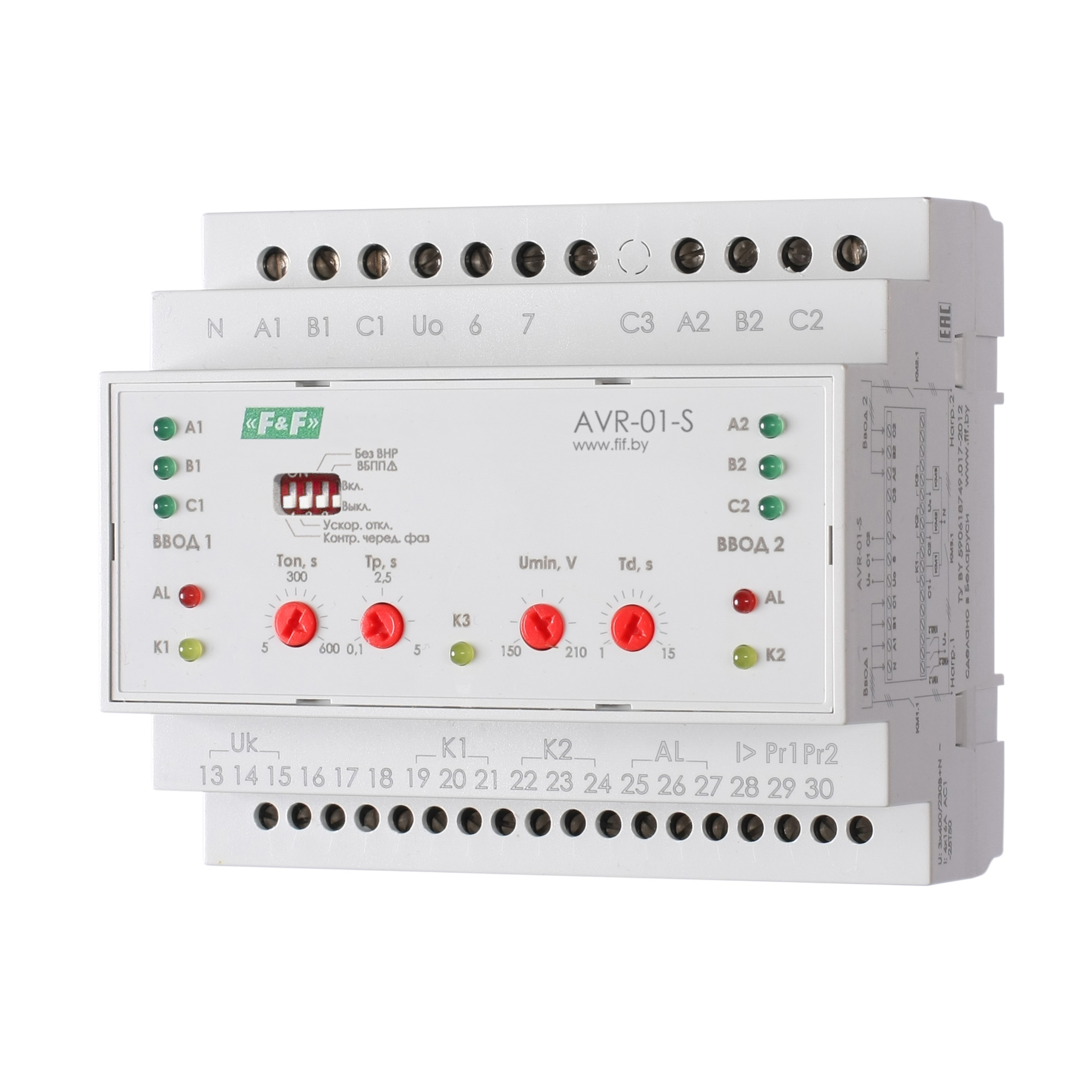 Устройство управления AVR-01-S контролирует напряжение на двух трехфазных вводах сети питания, если напряжение не выходит за установленные пределы, нагрузки подключены к соответствующим вводам с помощью внешнего коммутирующего устройства (контактор, автоматический выключатель с электроприводом и т.д.) управляемых устройством AVR-01-S. При выходе напряжения на одном вводе за установленные пределы (превышение, понижение и т.д.) питание нагрузки будет осуществляться от другого ввода, через секционный выключатель. После восстановления сетевого напряжения на вводе нагрузка восстановит питание от ввода. При переключении устройство контролирует положение контактов силового аппарата, чтобы при залипании его контактов не допустить включение секционного выключателя и тем самым не создать “встречного” напряжения. На протяжении всего времени работы осуществляется контроль аварийных цепей автоматических выключателей с электроприводом (цепь сигнализации, срабатывание теплового и/или электромагнитного расцепителей сверхтока), и в случае аварии отключает питание от неисправной нагрузки, до выяснения и устранения причин аварии и сброса аварийного состояния на устройстве AVR-01-S.